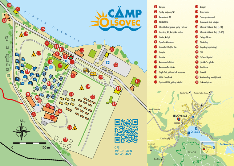 Leží na břehu stejnojmenného rybníka (40 ha) v obci Jedovnice. Kemp má kapacitu 1500 míst v různých formách ubytování: bungalovy, chatky, pokoje ve zděné budově, stany, karavany. K celoročnímu ubytování hosté využívají bungalovy a pokoje ve zděné budově.